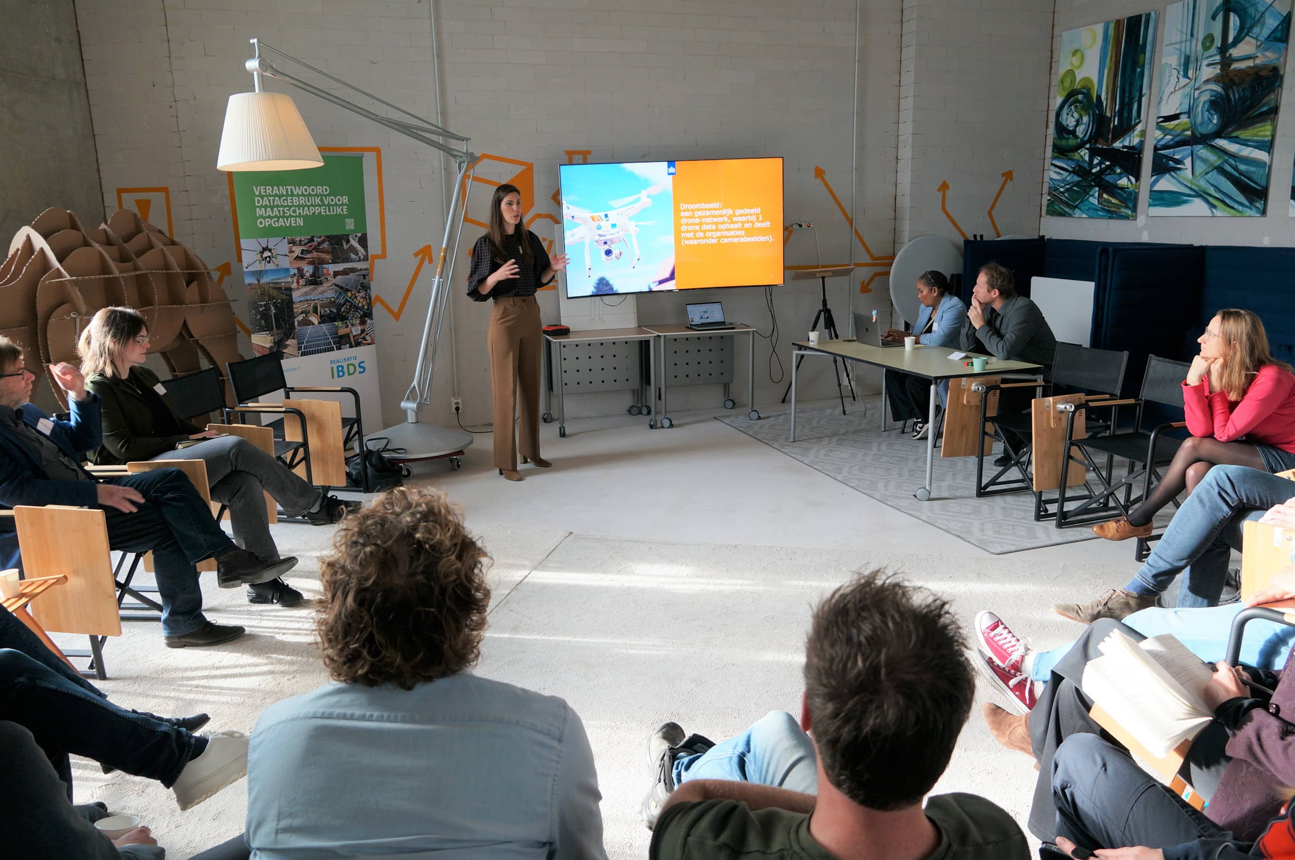 Een waterig ochtendzonnetje schijnt naar binnen in de creatieve ruimte De Plint, gelegen tussen de hoge gebouwen in de buurt van het Centraal Station in Den Haag. En hoewel de koffiemachine het na drie kopjes begeeft, kan niets nog in de weg staan van een mooie en productieve ochtend. Data- en gebruikersexperts uit alle hoeken van de overheid, industrie en maatschappelijke organisaties druppelen langzaam binnen. Tijd om te beginnen! Voormalig Tweede Kamerlid Kees Verhoeven neemt het woord. Hij begeleidt vandaag de Datadialoog namens IBDS en introduceert het thema van deze ochtend: het delen van data afkomstig van drones.