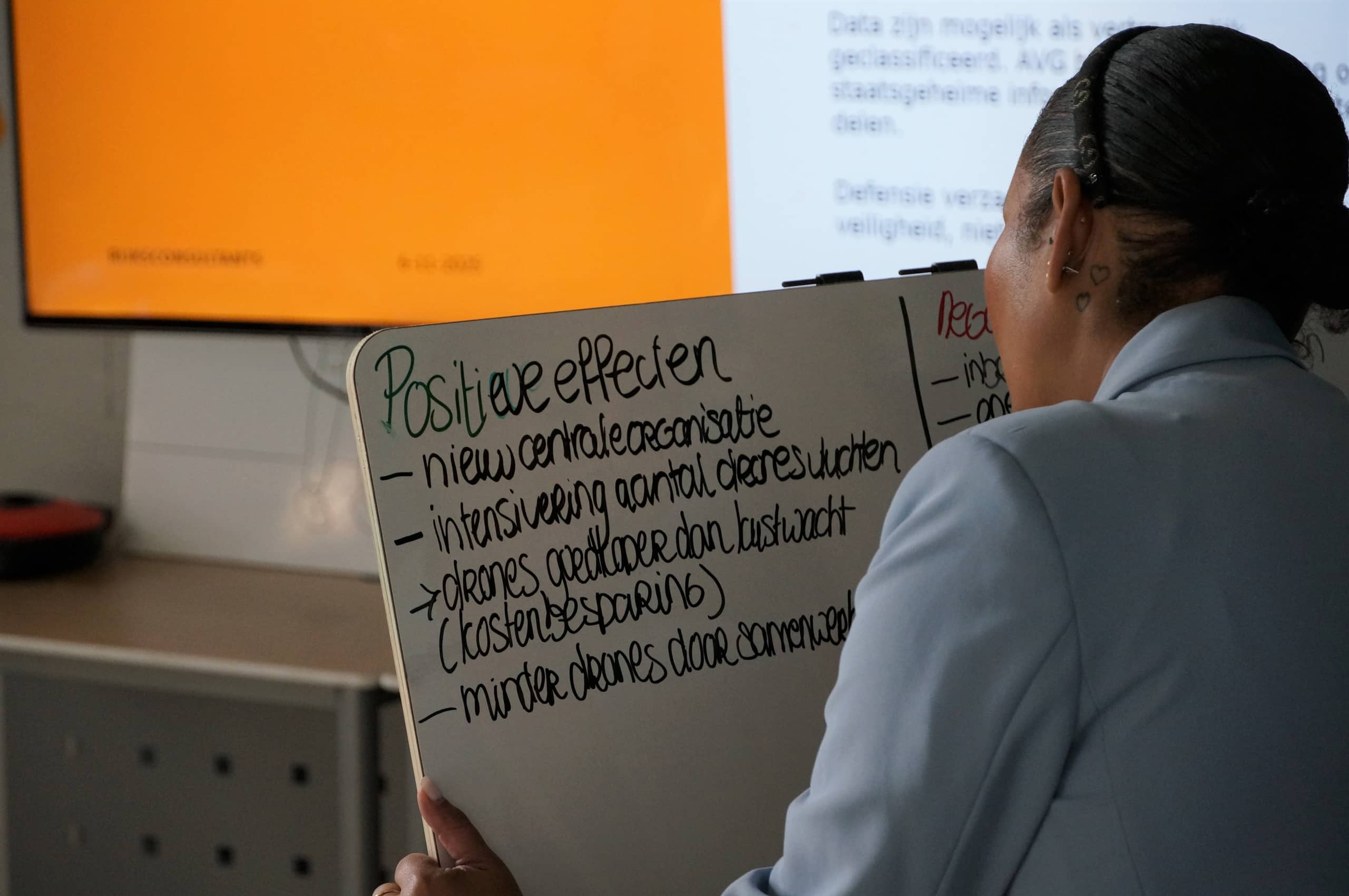 De groepen presenteren hun opbrengsten. “We moeten drones dom maken bij het verzamelen van informatie, maar slim bij het uitvoeren van de vlucht”, is een van de conclusies van de technologiegroep. Vanuit de beleidskant wordt gepleit voor het maken van een convenant met alle betrokken instanties, om afspraken te maken over het delen van data. Belangrijke opbrengst uit de gedragsgroep: “Ontwikkel scenario’s zodat medewerkers die met de drones werken, weten wat ze wel en niet mogen doen met de verzamelde data.”